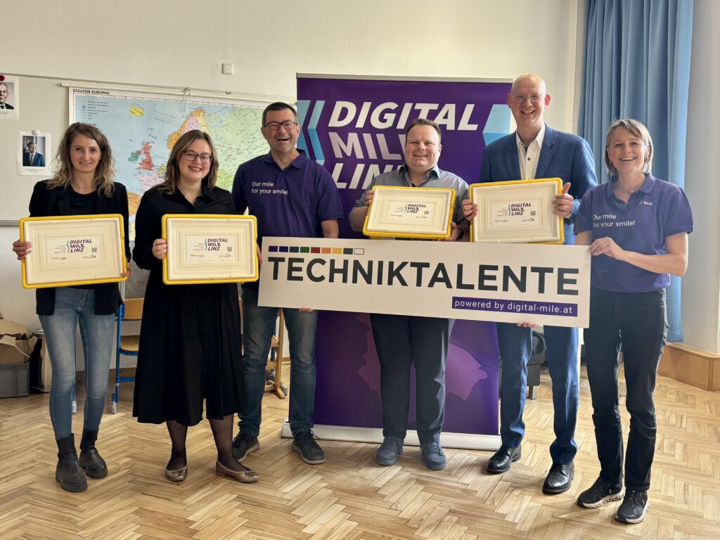 Die Weberschule freut sich über acht LEGO Education SPIKE Essential Sets für den Projektunterricht. Die Übergabe im Rahmen des Techniktalente Projektes erfolgte durch Vizebürgermeisterin Merima Zukan, Stadtrat Thomas Gegenhuber und den Verantwortlichen der Digital Mile Linz (März 2026)